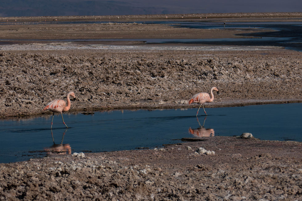 Nous redescendons dîner (il était temps, il est déjà 15:30) et nous terminons l'excursion au lac de Chaxa et sa réserve de flamants roses. Ce lac se trouve au milieu du salar d'Atacama qui est très différent du Salar d'Uyuni. Celui-ci n'est pas plat, mais formé d'une multitude de petites roches (en sel) qui se forment et se déforment au fil du temps.