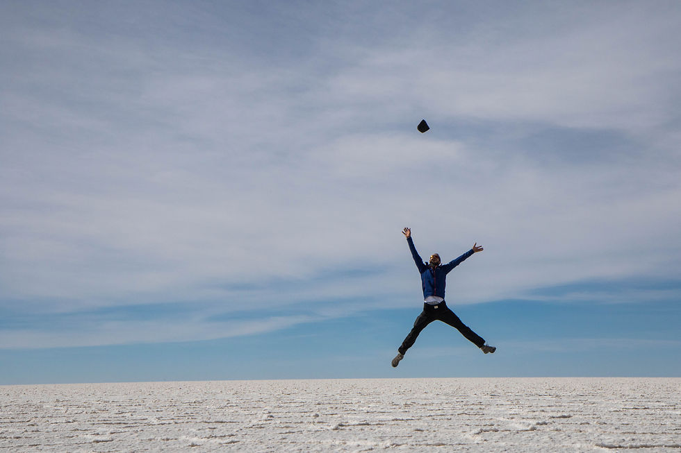 Nous remontons en voiture et Virgilio nous annonce tout sourire que cette fois sera le temps des fameuses photos que tout le monde fait sur ce Salar. Nous nous rendons donc au milieu de nulle part où l'horizon est visible et passons une heure à nous amuser avec les autres à faire quelques photos rigolotes.